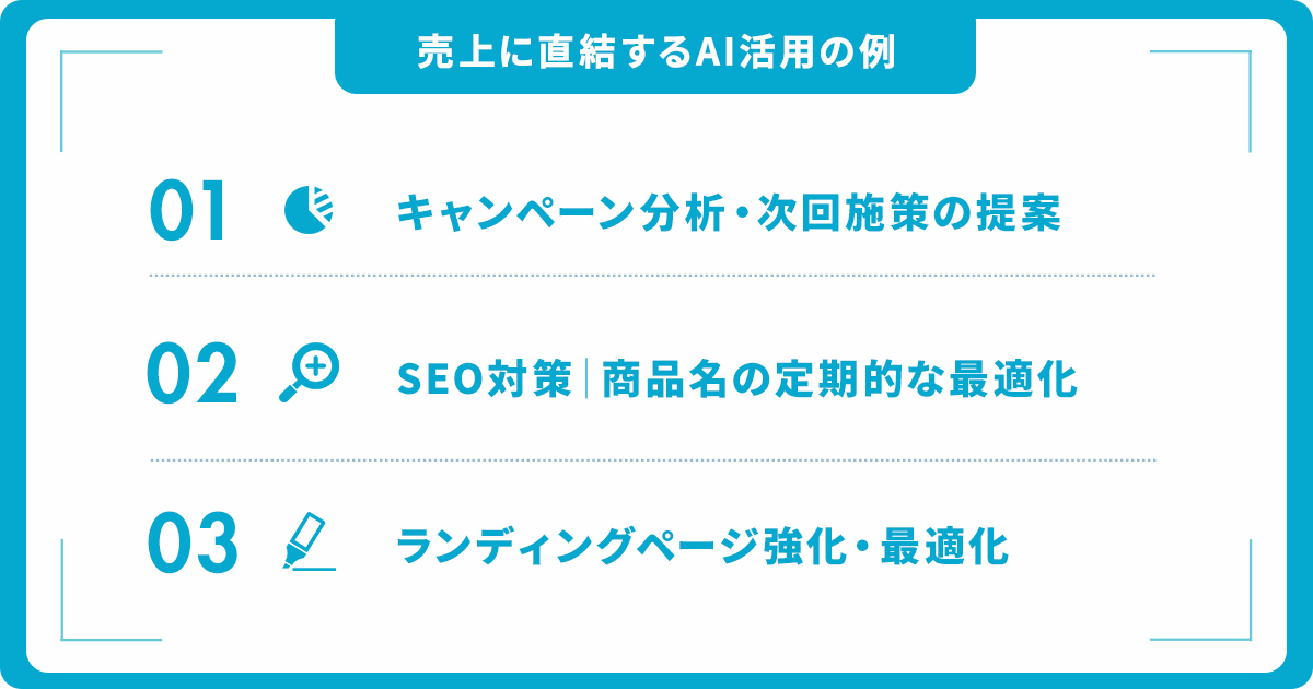 ここからは、楽天店舗でAIを使うと売上に直結しやすい3つのポイントを、事例を用いながらで紹介します。どれも現場の作業にそのまま落とし込めて、やった分だけ効果が出やすい活用法なので、ご参考ください。